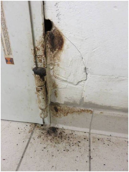 Traces de graisse (sébum) sur une cloison, signe d’un passage répété de rongeurs
