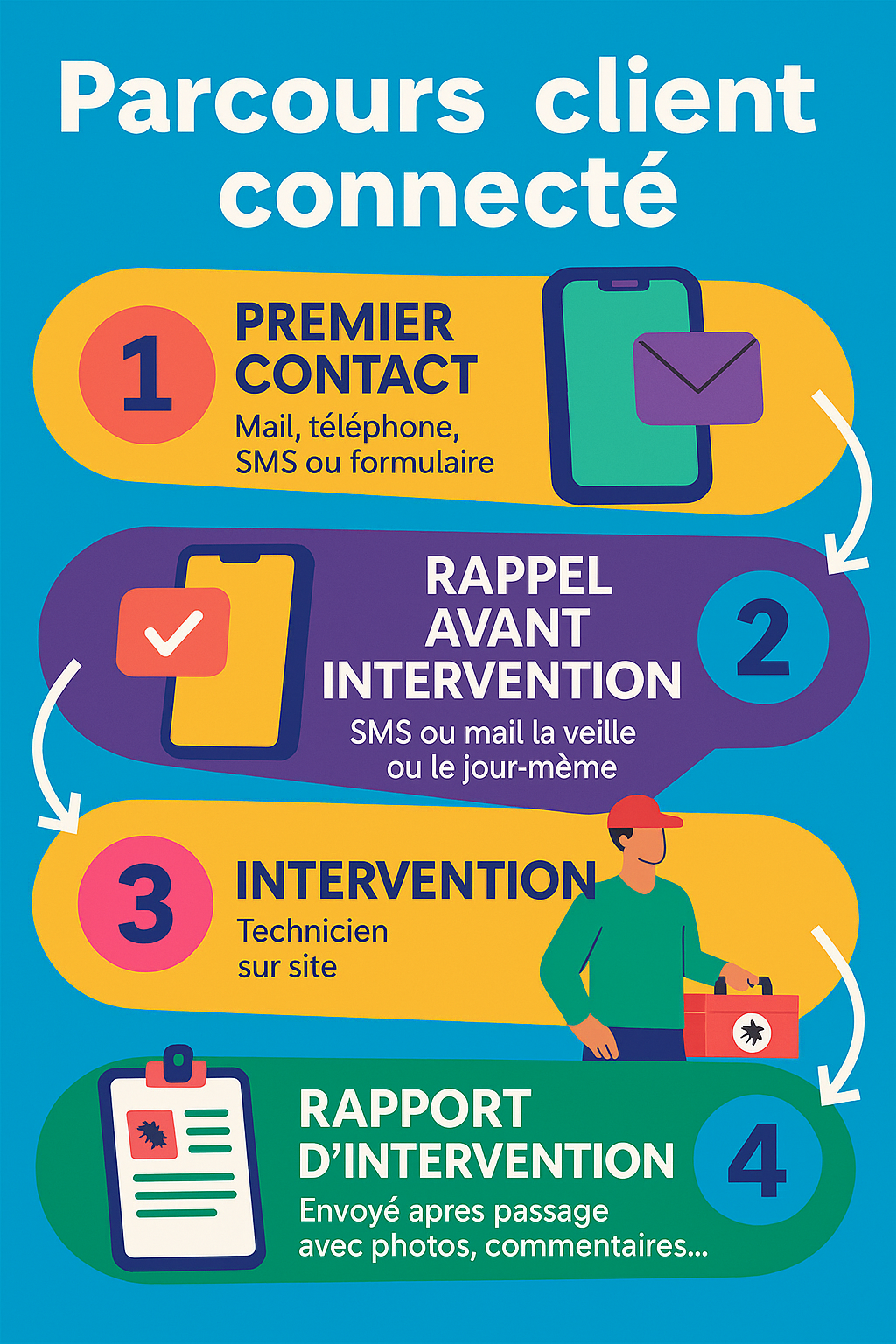 Dans les entreprises qui ont engagé cette transition, la relation client suit un schéma simple et rigoureux : rappel par SMS avec confirmation personnalisée, message de synthèse post-intervention, puis envoi rapide d’un rapport illustré. Cette séquence permet d’informer de manière fluide, même lorsque le client est absent, et participe à instaurer un climat de confiance.