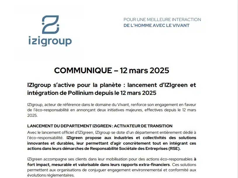 IZIgroup annonce deux initiatives majeures pour renforcer son engagement en faveur de l’environnement et de la biodiversité : la création d’IZIgreen, un département dédié à l’éco-responsabilité, et l’intégration de Pollinium, une entreprise spécialisée dans la pollinisation et le soutien à la filière apicole.